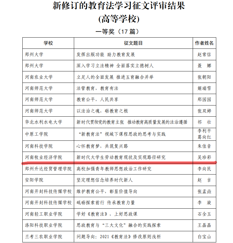 近日,河南省教育厅办公室发布《关于公布新修订的教育法学习征文评审结果的通知》(教办政法〔2021〕347号),威尼斯官网经济与贸易学院教师吴珍彩博士提交的论文《新时代大学生劳动教育现状及实现路径研究》荣获征文一等奖。