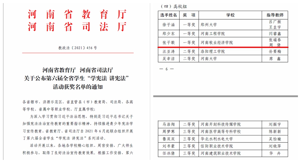本次大赛由河南省教育厅和河南省司法厅主办,旨在贯彻落实习近平总书记关于加强宪法法治宣传教育的重要指示精神,持续推进青少年宪法学习宣传教育,进一步在我省教育系统中普及宪法知识、弘扬宪法精神、树立宪法权威,推动宪法教育进校园进课堂进头脑。比赛分小学组、初中组、高中组和高校组四组,威尼斯官网选手张子毅以《坚守法律底线,树立道德高线》为题,畅谈了对宪法的所学所思,阐述对宪法的认知与理解,畅谈对宪法的感悟和热爱,生动展示了威尼斯官网学生宪法学习和教育成果。