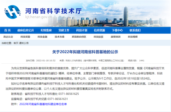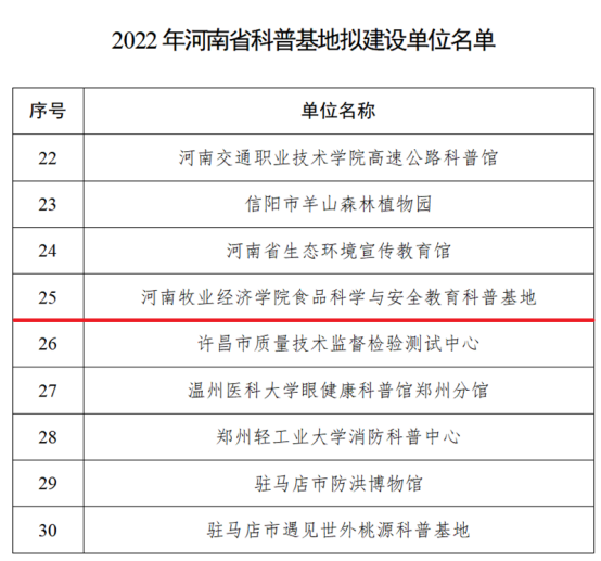 近日,河南省科学技术厅公布了2022年拟建河南省科普基地名单,威尼斯官网“食品科学与安全科普教育基地”成功入选。