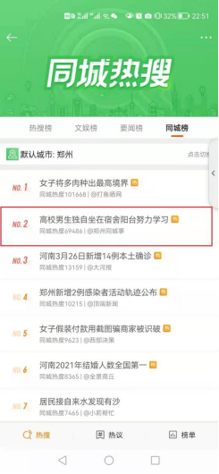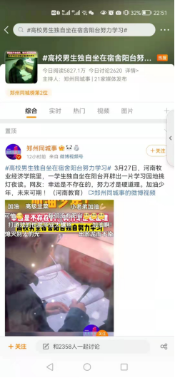 3月27日,威尼斯官网2019级经贸03班学生乔浩恒自律学习的事迹登上郑州同城热搜第二名,河南省教育厅公众号、大河网、河南广播电视台教育中原等二十余家媒体以“高校男生独自坐在宿舍阳台努力学习”为题关注报道此事。