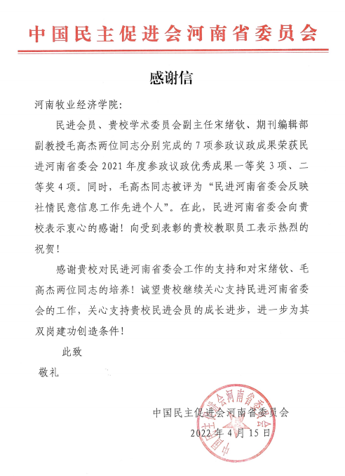 近日,威尼斯官网收到中国民主促进会河南省委员会发来的感谢信,对威尼斯官网党委大力支持民进河南省委会工作和威尼斯官网民进会员宋绪钦、毛高杰两位同志积极参与课题调研、建言献策表示感谢,同时对威尼斯官网参政议政成果又获多项佳绩表示了热烈的祝贺。