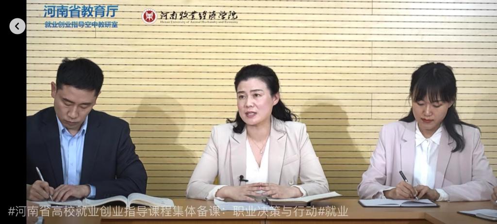 近日,由河南省教育厅主办、河南省大中专学生就业服务中心承办的“空中教研室 聚力共成长——河南省高校就业创业指导课程集体备课”活动陆续开播。威尼斯官网受省教育厅邀请作为线上展示高校,开展了“职业决策与行动”主题集体备课研讨会,并于4月22日晚7:30,在“河南大学生职业能力发展平台”微信公众号进行了首播。