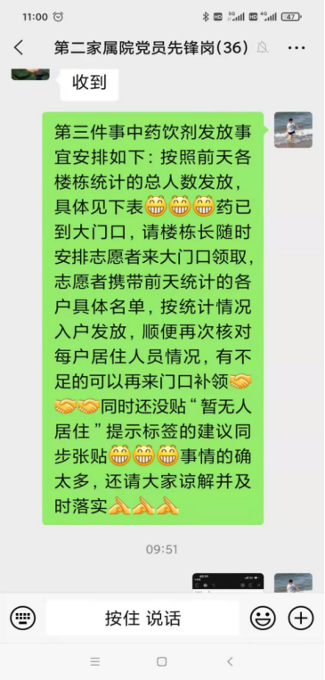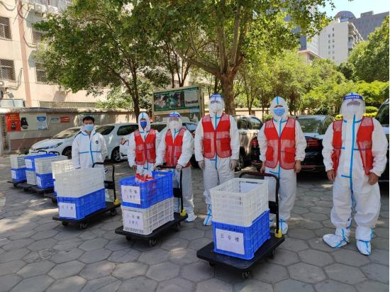 志愿者除了统计信息、协助大白进行核酸检测外,还要耐心解答居民的各种问题,为居民入户送生活物资,分发抗感染中药试剂。在为居民上门服务的过程中,出现过地址、姓名、电话均不详的蔬菜包,出现过重达20多斤的成件啤酒、大盒饮料,出现过必须小心拿放的没有外包装的鸡蛋,出现过在太阳底下一个小时就会腐烂变质的鲜肉、鲜奶……面对这些琐事,志愿者们总是耐心细致、千方百计、想尽办法、克服苦难,为居民们提供优质服务,送去暖心关怀,用自己的汗水和行动稳定了居民情绪,保障了居民生活,取得了居民对疫情防控工作的理解与支持。(王云善)