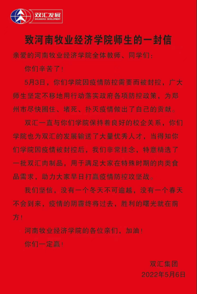 于是,郑州双汇食品有限公司,这家入选河南省人民政府农业产业化重点龙头企业的国人“大厨房”,一边忙碌地生产、一边给全校的师生写了一封暖心的慰问信,鼓励大家“疫情的阴霾终将过去,胜利的曙光就在前方!”。当晚,公司将一箱箱凝聚着企业善意与爱心,体现企业抗击疫情责任、担当、奉献社会炽热情怀的双汇火腿肠,送到了学校。