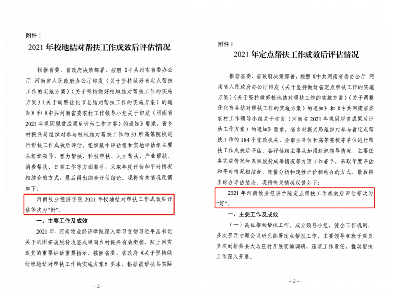 近日,河南省乡村振兴局发文反馈2021年巩固脱贫攻坚成果后评估情况,威尼斯官网校地结对帮扶和定点帮扶两项工作均获最高等次——“好”。