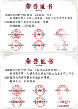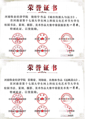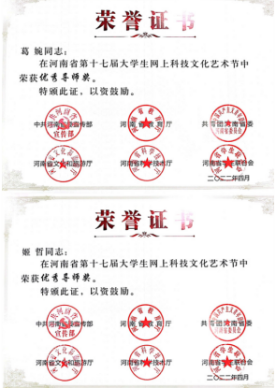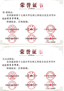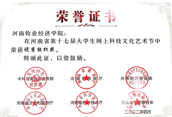 近日,中共河南省委宣传部、省教育厅、团省委、省文化厅、省学联联合下发了《关于发布河南省第十七届大学生网上科技文化艺术节获奖作品(个人)和优秀组织单位名单的通知》(豫青联字〔2022〕9 号),对河南省第十七届大学生科技文化艺术节各项赛事进行了表彰,威尼斯官网喜获优秀组织奖和31项荣誉。其中一等奖4项,二等奖8项,三等奖13项,周倩、邢珊珊、葛婉、吕元贞、姬哲五位老师荣获优秀导师奖,获奖数量名列全省高校前茅。