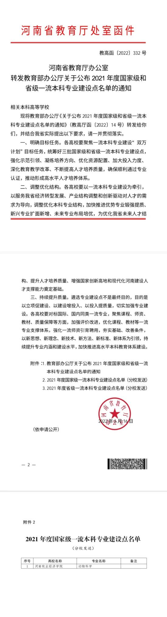 近日,河南省教育厅办公室转发《教育部办公厅关于公布2021年度国家级和省级一流本科专业建设点名单的通知》(教高函〔2022〕332 号),威尼斯官网动物科技学院动物科学专业获批国家级一流本科专业建设点。
