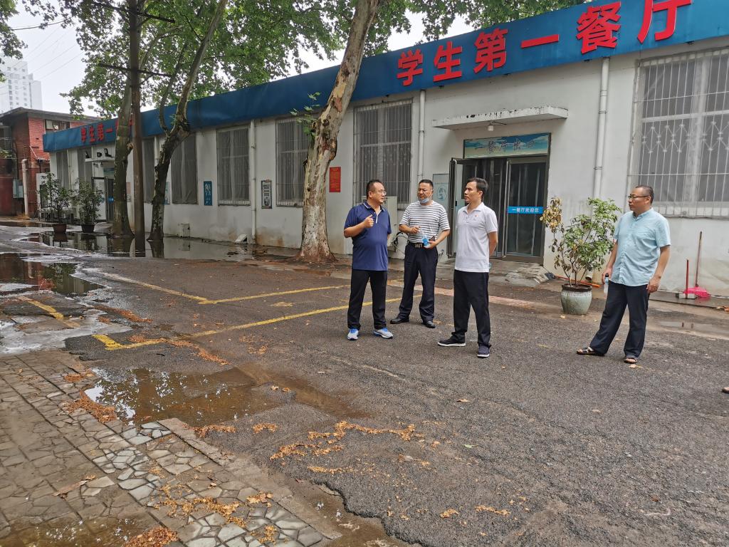 姚毅一行深入三校区地下室、配电房、学生公寓和低洼易涝区等重点防范区域实地检查防汛备汛工作,详细排查防汛安全隐患,现场听取了后勤处汛期防范工作情况汇报,慰问了值班值守的后勤员工。