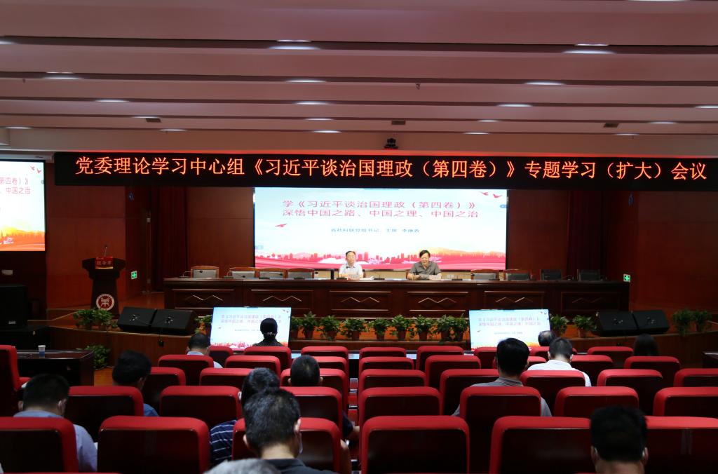 8月24日,学校召开党委理论学习中心组《习近平谈治国理政》第四卷专题学习(扩大)会议,会议以现场及视频会议形式分别在龙子湖校区图书馆一楼报告厅和英才校区学术报告厅等3个会场同步举行。省社科联党组书记、主席李庚香以《学<习近平谈治国理政(第四卷)> 深悟中国之路、中国之理、中国之治》为题作专题辅导报告。学校党委理论中心组成员、副处级以上干部、马克思主义学院教师参加会议,会议由党委副书记李俊杰主持。