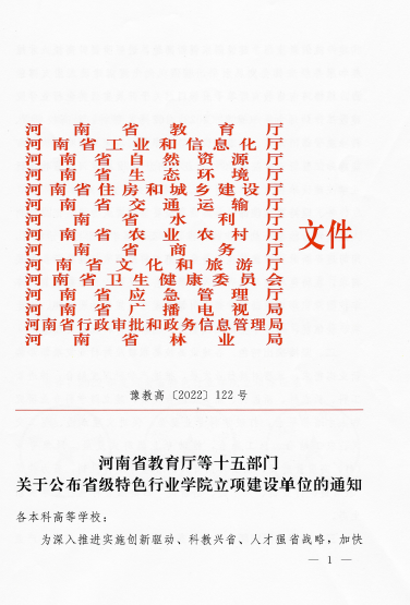 根据河南省政府《关于提升高校科技创新能力的实施意见》的精神要求,2022年5月,河南省教育厅在全省高校范围内开展了现代行业学院的申报工作,目标在于聚焦行业共性技术和转型发展需求,打造融人才培养、科学研究、技术创新、企业服务、学生创业等功能于一体的示范性人才培养实体。