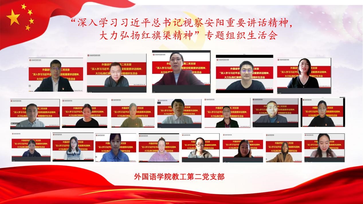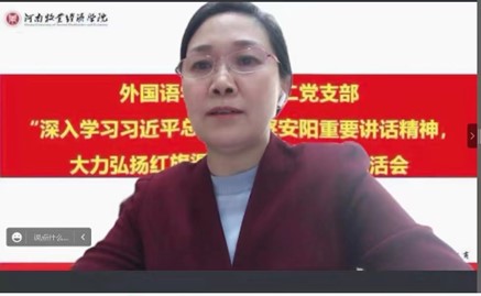 11月19日,外国语学院教工第二党支部线上召开“深入学习习近平总书记视察安阳重要讲话精神,大力弘扬红旗渠精神”专题组织生活会。副校长杨志清以普通党员身份参加并指导组织生活会,校纪委综合办主任曹瑛、副主任杨宇列席指导会议,外国语学院领导班子、支部全体党员参会。会议由外国语学院副院长、党支部书记闻华主持。