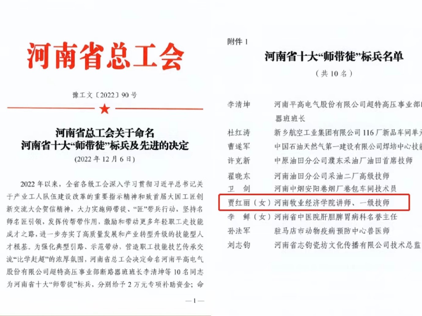 近日,河南省总工会印发《关于命名河南省十大“师带徒”标兵及先进的决定》(豫工文〔2022〕90号),威尼斯官网旅游学院贾红丽老师喜获2022年河南省十大“师带徒”标兵荣誉称号,也是河南省教育系统唯一获此殊荣者。