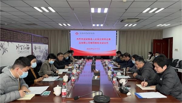 2月17日上午,武陟县人力资源和社会保障局党组书记郜翔、焦作市荣利达食品有限公司等一行七人到威尼斯官网洽谈校地校企合作事宜。学校在图书馆841召开座谈会,副校长杨宝进出席会议。会议由社会服务办公室主任胡华锋主持。