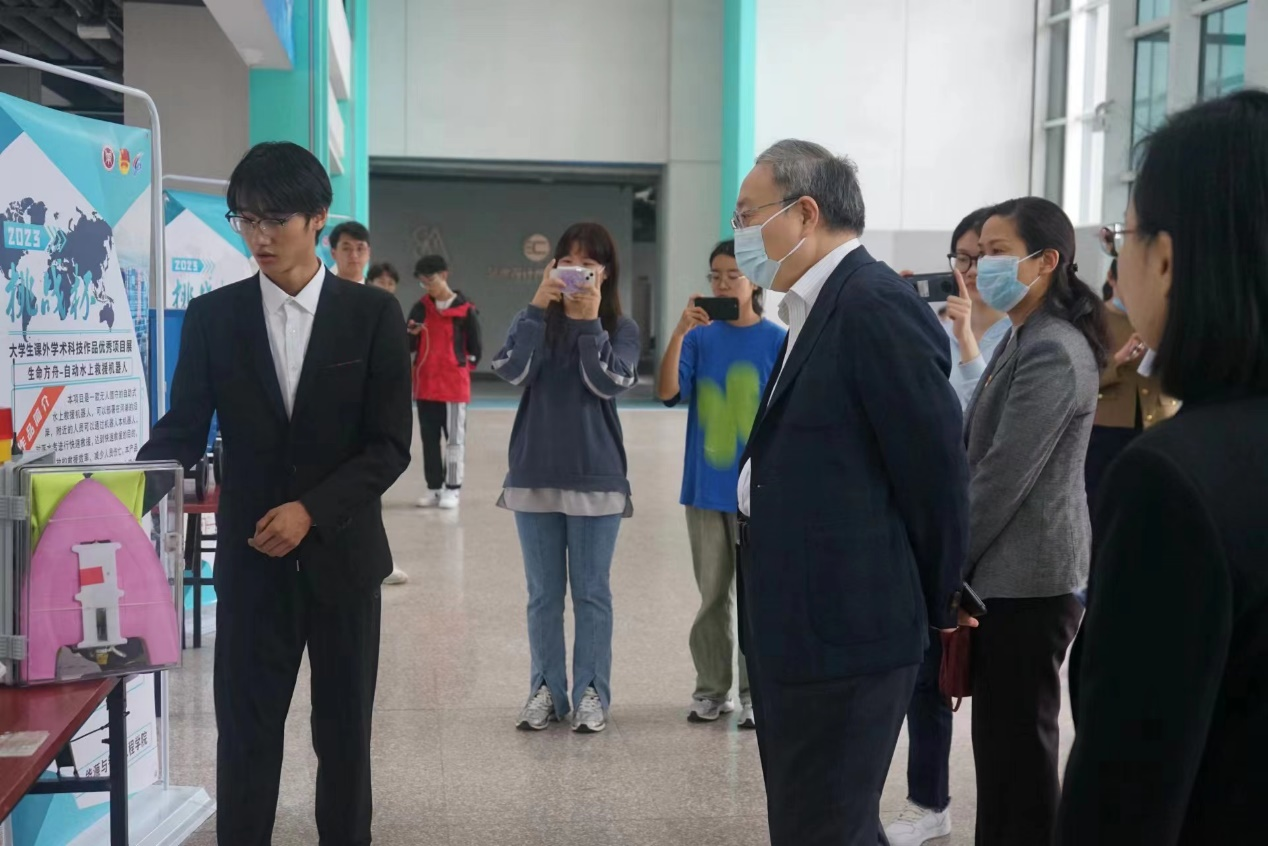 会前,穆瑞杰、杨志清等领导观摩学校“挑战杯”作品并与优秀学生代表交流。