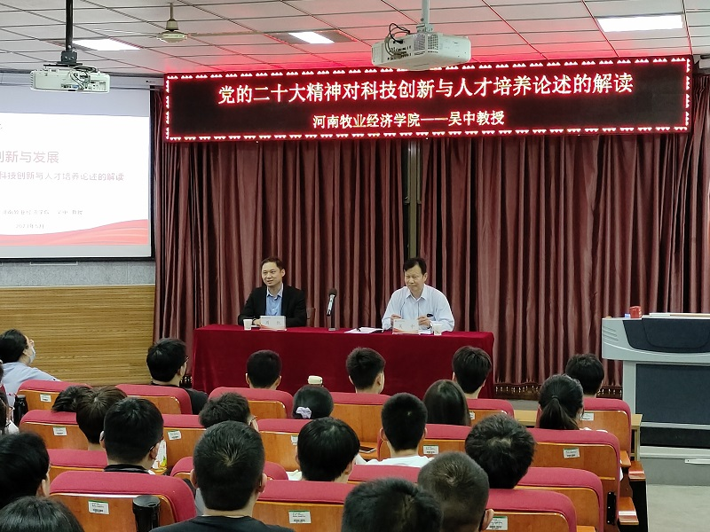 吴中从“三个方面加深认识‘三位一体’”、“我国发展面临的新的战略机遇,深刻把握全面建设社会主义现代化国家面临的形势”以及“如何成为创新型人才,创新型科技人才需要具备四个特质”等三个方面全面系统地阐述了科技创新与人才培养的时代新内涵。吴中指出,要深刻理解主题教育的重大意义,学出思想真谛,坚持读原著、学原文、悟原理,做到内化于心、外化于行,把党的创新理论转化为实践伟力。他强调,要全面把握习近平总书记关于教育、科技和人才重要论述的深刻内涵,结合学院在“牧工商一体化”中“工”的特点,守正创新、自立自强,牢牢把握百年未有之大变局,持续培养创新型人才,为高质量发展塑造新动能。吴中在党课中寄语广大青年学生,要牢记习近平总书记的殷切期盼和谆谆教诲,志存高远、脚踏实地,学好知识、练好技能,努力成为创新型科技人才,让青春在全面建设社会主义现代化国家的火热实践中绽放绚丽之花。