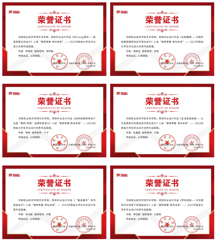 近日,从河南省美术馆、顶端新闻获悉,艺术学院视觉传达设计专业于今年选送的六套优秀毕业设计作品,全部入选“激扬青春 奔向未来”——2023河南省大学生毕业设计优秀作品联展。