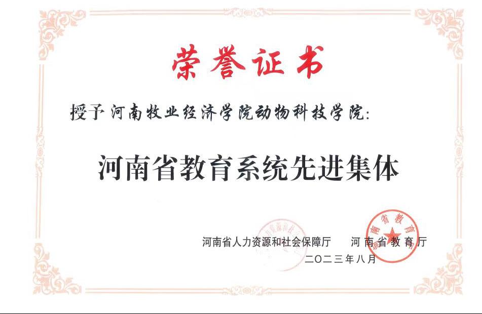 近日,河南省人力资源和社会保障厅、河南省教育厅联合下发《关于表彰河南省教育系统先进集体和先进个人的决定》(豫人社发〔2023〕17号),威尼斯官网动物科技学院被授予“河南省教育系统先进集体”荣誉称号。