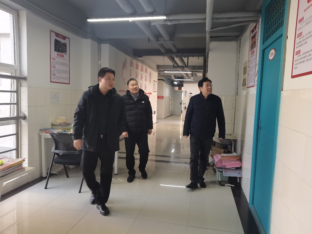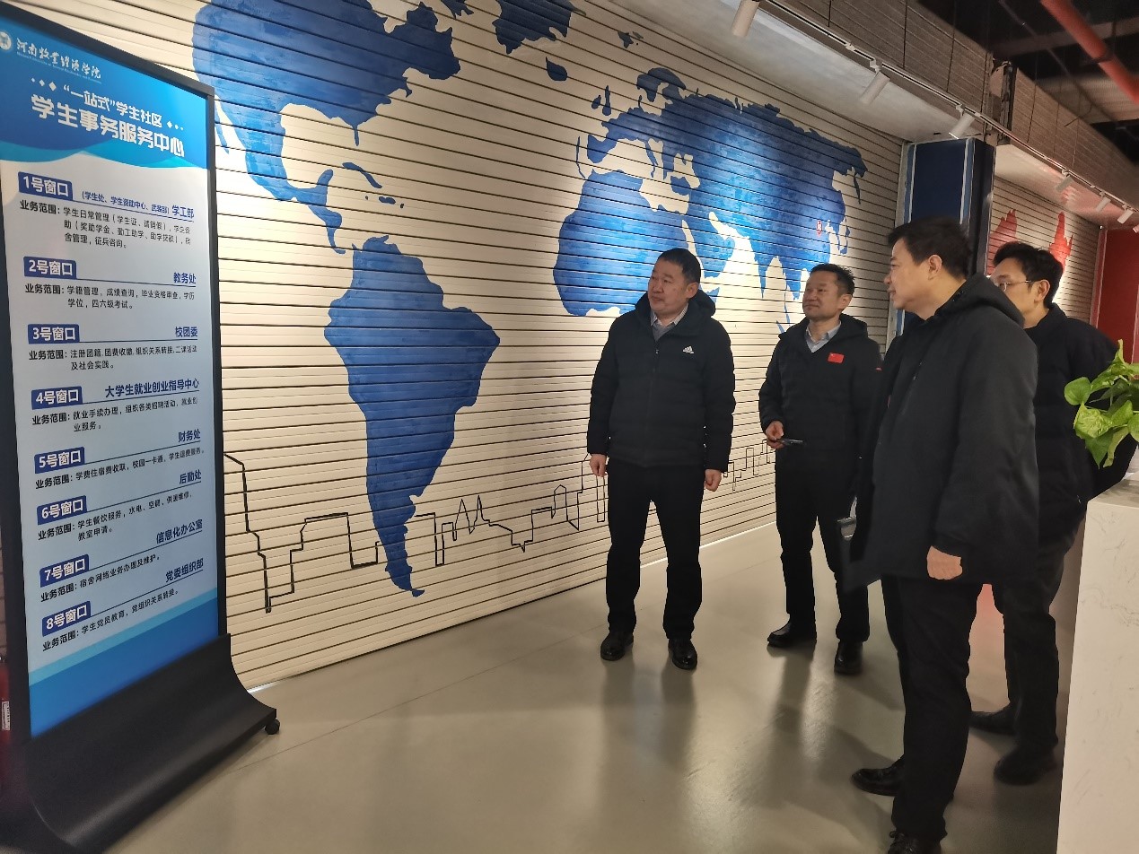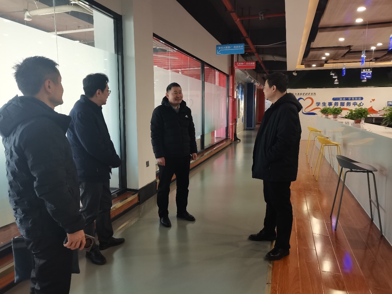 刘红生、张朝阳一行实地参观了龙子湖校区“一站式”学生社区学生事务服务中心,就服务大厅的日常运营等工作进行沟通交流。随后,双方深入学生社区,对学生社区的公共空间布局和社区党建活动室、心理活动室、学生自习室等地进行考察。(杨梅 文/图)