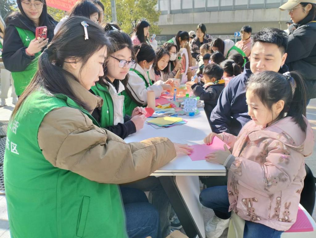 活动现场共分为创意手工区、变废为宝区和游戏竞赛区,在志愿者们耐心细致的讲解的指导操作下,一张张普通的纸、一个个废旧的塑料瓶焕发新生,变成了一个个“纸杯太阳花”、“非遗折花”和“塑料笔筒”等创意作品。游戏竞赛区,纸飞机大赛让小朋友们放飞梦想,送垃圾回家的互动知识竞赛诠释了垃圾分类的重要性,也让小朋友们掌握了更多关于垃圾分类的知识。活动现场气氛热烈,每位小朋友都积极参与、相互比拼、分享自己的作品,大一点的孩子还主动加入到志愿者队伍中,为身边的小朋友教授手工技巧,充分发扬了互帮互助的精神。活动结束后,小朋友们纷纷与自己的“老师”们合影留念,晒出自己的作品。
