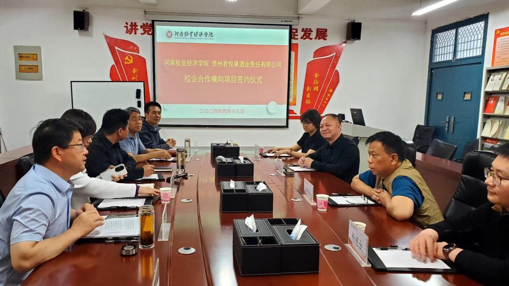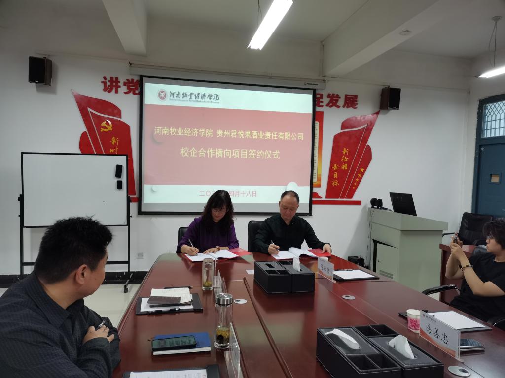 4月18日,威尼斯官网与贵州君悦果酒业有限责任公司的横向项目“刺梨酒关键技术研发及产业化”签约仪式在学校龙子湖校区生工组团A426会议室举行。科学技术处处长潘春、食品与生物工程学院院长邹建及该院项目相关负责人、贵州君悦果酒业有限责任公司董事长王愿坚、总经理易善忠参加签约仪式。