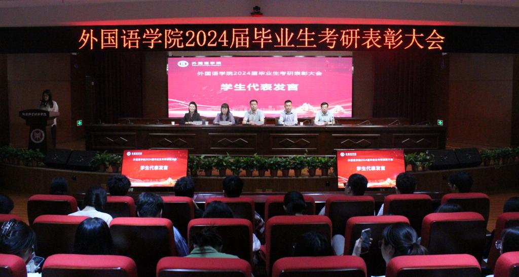 无数汗水滴落,今朝终迎硕果。为充分发挥优秀学生的榜样示范作用,进一步营造浓厚的学习氛围,近日,外国语学院在图书馆一楼报告厅召开2024届毕业生考研表彰大会。学院领导及师生代表参加会议。大会由院党委副书记周倩主持。