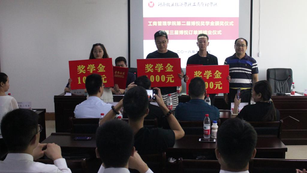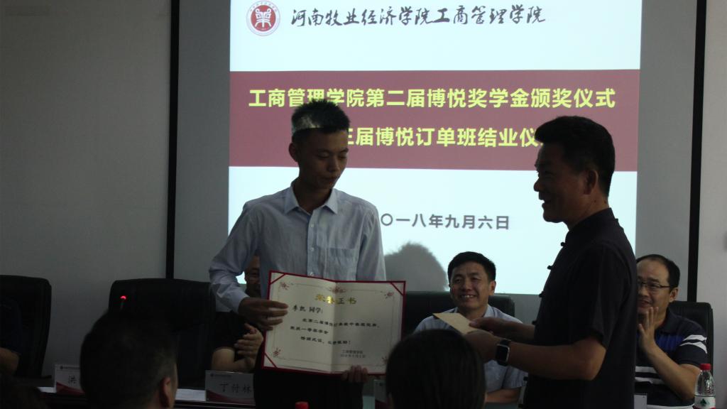 9月6日上午,工商管理学院在英才校区教学办公楼227举行第二期“博悦奖学金”颁奖仪式。工商管理学院副院长陈先锋、党总支副书记王国辉和郑州博悦汽车服务有限公司总裁丁付林等出席颁奖仪式,订单班获奖学员和第三届博悦订单班学员参加会议。