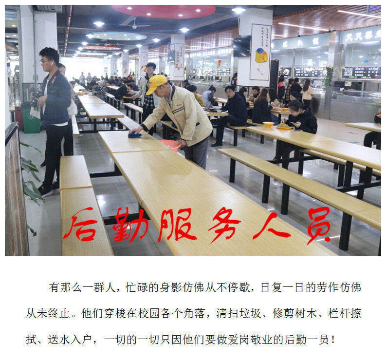 一年一度的五一劳动节即将来临,这是属于全体劳动者的节日。习近平总书记曾经说过:“劳动没有高低贵贱之分,任何一份职业都很光荣。”我们每一个平凡的岗位,每一个普通的劳动者都是实现中华民族伟大复兴中国梦的追梦人和实干家。今天请跟随软件学院的镜头,让我们聚焦大学校园,致敬每一个岗位上平凡而伟大的劳动者!(软件学院 陶莎莎)