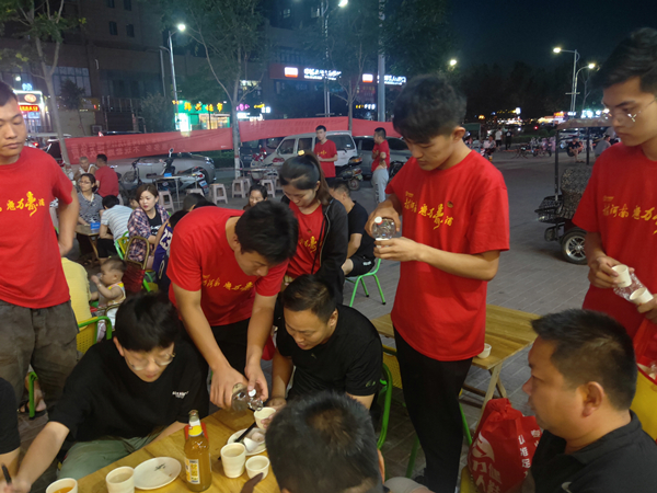 7月7日,服务队分别前往新乡卫辉县和焦作修武县开展白酒市场调研和寿酒新产品推广活动。队员们在当地销售点业务员的带领下前往附近的饭店,向消费者推荐并邀请品鉴寿酒新产品,同时向消费者详细介绍产品的生产工艺和储藏方式。