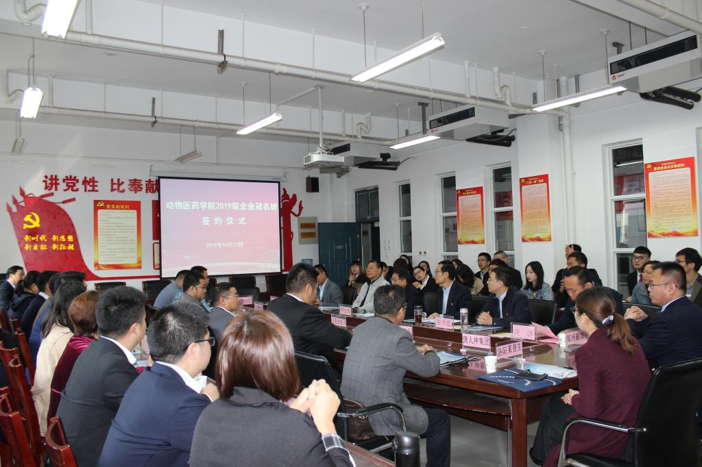 为深入贯彻落实“不忘初心、牢记使命”主题教育活动,学习习近平总书记在河南考察时讲话精神,共同探讨校企合作新机遇和人才培养新模式。10月17日上午,动物医药学院在生工楼C-401会议室举行2019级企业冠名班签约仪式。校长罗士喜、社会服务办公室主任胡迎利、党委宣传部副部长张瑞春、动物医药学院党委书记刘永录、院长宋予震和来自北京德青源农业科技股份有限公司等17家企业的负责人出席签约仪式。签约仪式由院党委副书记汪洋主持。
