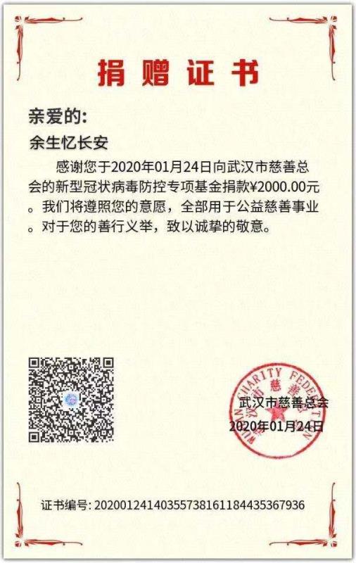 其中该院19级商英03班李润珂同学一直关注这次疫情,当看到武汉各大医院物资短缺的信息,将自己课余时间勤工俭学的2000元钱拿出来,通过微博平台捐给了武汉市慈善总会。