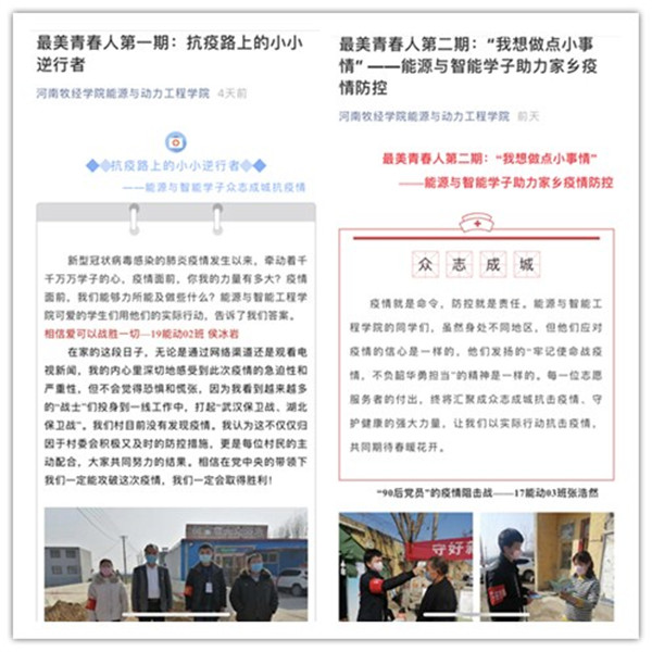 “做一点工作也许微不足道,但是以此传递正能量也是我们实现自我价值的方式。”在疫情防控的特殊时期,党员志愿者主动担当作为,在全国各地为疫情默默的奉献他们的青春力量,汇成了一道光芒。党支部教师党美珠、张彤老师主动参加学校北林家属区疫情检测点登记排查工作。17机械班党员学生乔振家报名参加新密市嵩阳路社区组织的村内道路设卡盘查志愿服务,17能动01班郭家驹辅助南阳市宛城区田庄做路口执勤,16能动03班张中怀在商丘市民权县白云寺镇村站岗等等,还有很多学生党员们都主动报名参与了当地的抗疫阻击战,他们学习疫情的相关知识,挨家挨户宣传疫情防范知识,增强家乡人的防范意识;协助社区或者村委工作人员做好防疫卡点值守,对车辆和人员进行逐一排查登记和体温测量,确保家乡群众平安。