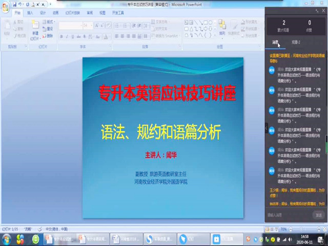 近日,外国语学院组织了线上专升本英语应试技巧讲座----《语法规约和篇章分析》,讲座由外国语学院副教授闻华主讲,专升本报考学生及有报考意向的学生聆听了本次讲座。