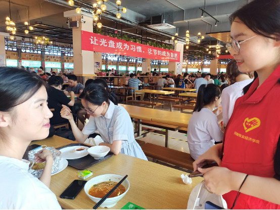 文法学院“环手爱”志愿者组建“节约用餐宣传队”,广泛宣传习近平总书记对制止餐饮浪费行为的重要指示精神,弘扬“爱惜粮食,拒绝浪费”的勤俭节约思想;在中午、晚上用餐高峰期,走进食堂呼吁同学们减少餐桌浪费,共同制止餐饮浪费行为;针对剩饭剩菜的同学,普及节约粮食的重要性,提倡从自我做起践行“光盘行动”;积极动员全院学生参与学校倡导的“爱惜粮食,拒绝浪费”光盘打卡活动,提高同学们参与活动的主动性。