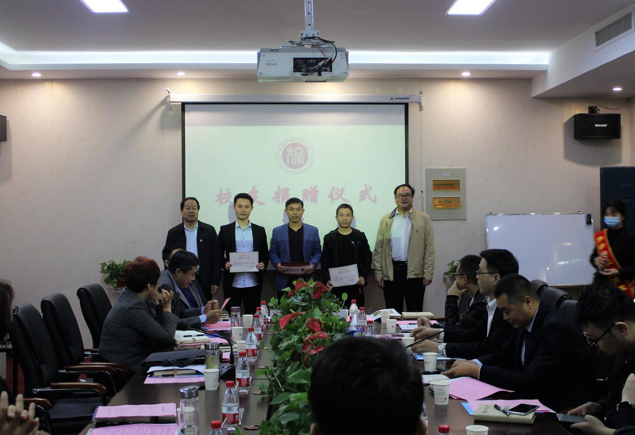 为了表达校友们对母校的培养之情,旅游学院举行了校友捐赠仪式,张伟、旅游学院党委书记李喜民为校友颁发捐赠证书,该学院为校友们准备了学校的吉祥物“牧小经”。