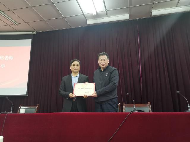 讲座后,文法学院聘请李建伟为该院客座教授,刘明江为其颁发聘书。