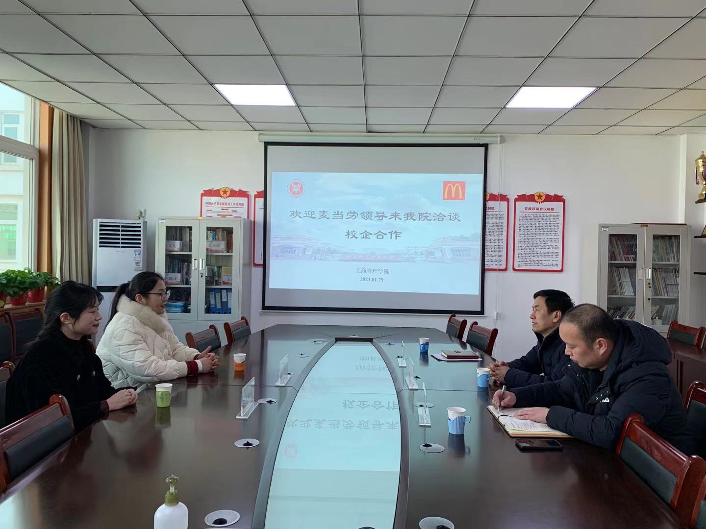 1月29日,工商管理学院与河南迈乐加餐厅食品有限公司在英才校区教学楼412会议室召开“校企合作洽谈会”。河南迈乐加餐厅食品有限公司经理于海霞及校企合作业务负责人谢林焱,工商管理学院副院长陈先锋出席会议,工商管理教研室主任陈科和工商管理教研室骨干教师参加会议。
