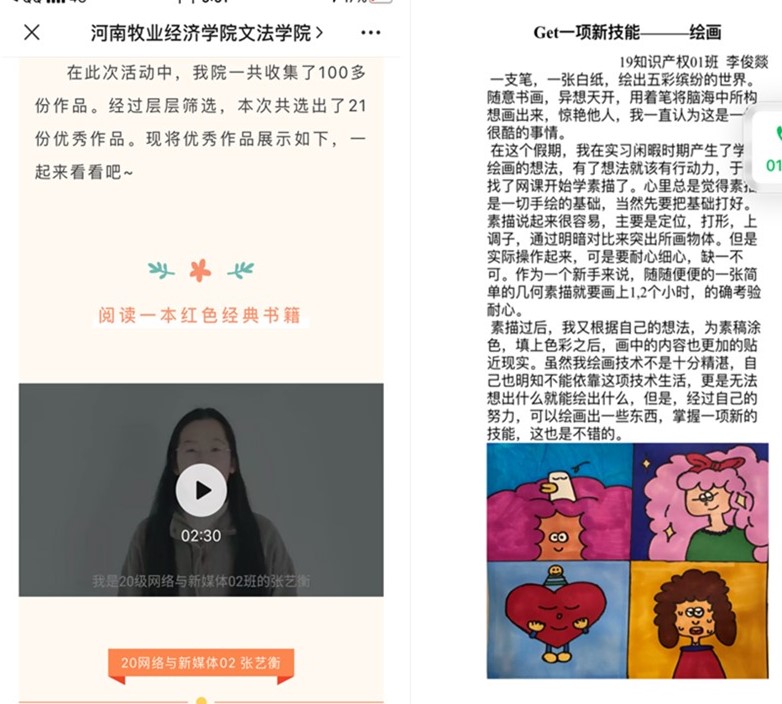 文法学院广泛宣传、积极发动学生阅读一本红色经典书籍、观看一部红色影片(电视剧,政论片)、讲述一个感人的抗疫故事、Get一项新技能,让青年学生在活动中受到教育、锻炼能力、增长才干。目前文法学院学生已提交100余份活动作品,并在学院微信公众平台进行展播,持续发挥育人功效。