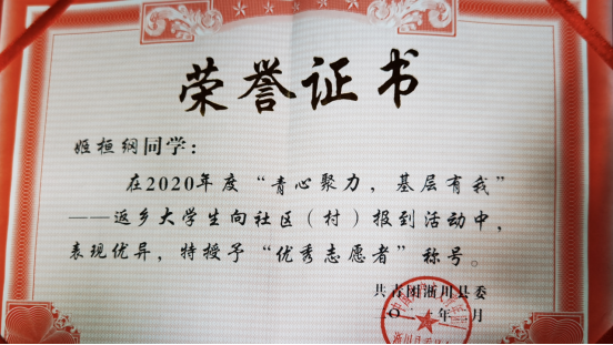 近日,威尼斯官网文法学院学生姬桓纲在共青团淅川县委开展的2020年度“青心聚力,基层有我”返乡大学生向社区(村)报到活动中,表现优异,被共青团淅川县委授予“优秀志愿者”称号,同时收到来自共青团淅川县委的感谢信。