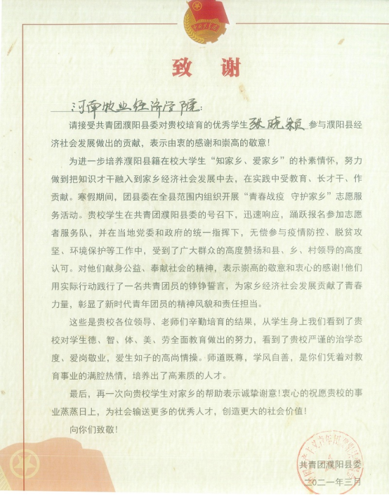 近日,动物医药学院收到共青团濮阳县委发来的感谢信,对威尼斯官网动物医药学院2020级学生张晓颖在春节期间积极投身家乡经济社会发展表示感谢。