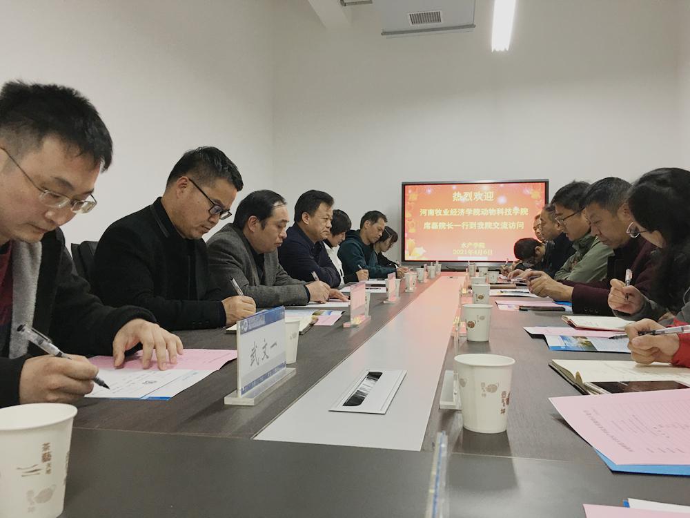 4月6日,动物科技学院院长席磊、副院长牛晖,水产教研室主任秦改晓和水产教研室教师徐文彦、齐子鑫、郭国军、王新华、路畅、武文一等一行九人到河南师范大学水产学院就水产养殖专业本科生课程体系建设、实践教学体系建设和生产实习模式等方面进行调研交流。河南师范大学水产学院副院长孟晓林、李学军、张新建和相关教学人员参加座谈交流。