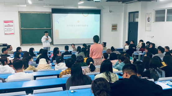 优秀毕业生陈文杰、杨舒分别从求职准备、就业择业经历、就业感悟、就业状况分析等方面与现场学生分享经验,并对学生在求职过程中遇到的困惑与问题进行解答。