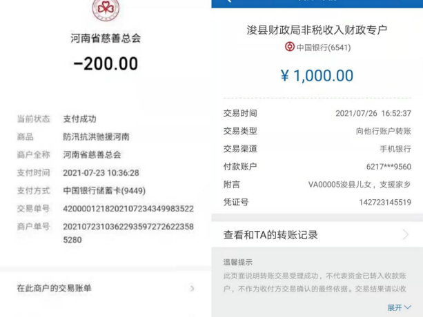 王瑞平老师得知家乡浚县发生严重洪灾、两个乡镇全被淹没的消息,立即向县财政局财政专户捐款1000元。她说,“作为浚县儿女,非常牵挂家乡的父老乡亲,愿意克尽绵薄,为家乡救灾工作出点力。”程花琴、马丽、任宇涵等教师通过河南省慈善总会各捐款200元,支援救灾工作。