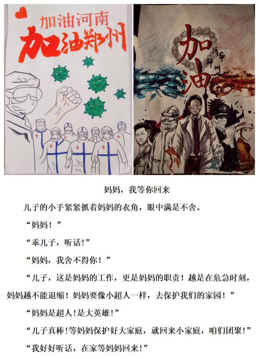 该院团委积极开展抗疫主题创作活动,弘扬主旋律,传播正能量,扎实做好大学生思想政治教育。广大学子积极行动,用手中的笔讴歌抗疫精神,在温暖有力的镜头背后,是学生对一线战疫工作者的致敬与坚信战疫必胜的决心。2020级食品质量与安全专业02班高璇创作的《加油郑州,加油河南》,鲜明体现出在这场看不见“硝烟”的战疫中,医护人员不畏艰难险阻,以针为“剑”,以科学为“刃”,坚持 守护着生命的最后一道防线。2018级食品科学与工程专业02班王晓珂创作的《妈妈,我等你回来》,深情讴歌了抗疫一线的医护人员舍小家为大家的时代担当。一幅幅作品致敬在抗击疫情一线的医护人员,诠释着学生万众一心、众志成城的情怀与担当。(马永生/文)