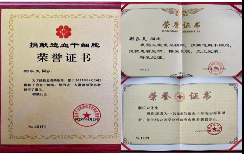 荆乐天在校期间,担任班长和学院团学会副主席的职务,平时积极为同学服务,热心公益事业,经常主动参与学校和学院组织的各类志愿实践服务活动。自2021年6月11日起,荆乐天开始了无偿献血之路,他先后完成了四次无偿献血,并加入了中华人民共和国造血干细胞捐献者资料库。2023年2月27日,一通来自郑州市红十字会的电话,荆乐天同学的HLA分型资料与一名白血病患者初步相合,他深知,配型成功的概率只有万分之一甚至几十万分之一,这几乎是受捐者延续生命“唯一的机会”。他毅然决然同意了捐献。在做出捐献决定后,荆乐天告知父母自己的决定,父母表示大力支持,在捐献期间,一直陪同在他的身边。