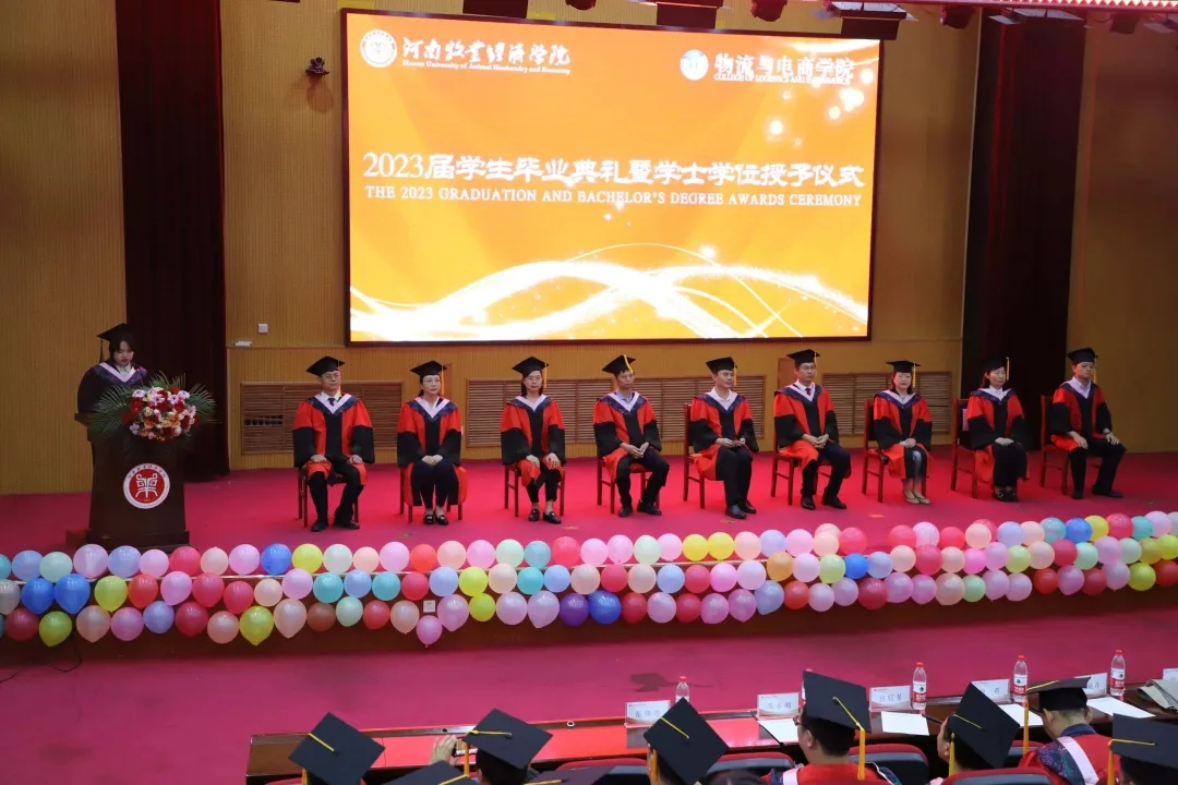 毕业典礼暨学位授予仪式在庄严的国歌声中拉开序幕。物流与电商学院党委书记于晓胜、副院长李艳菊分别宣读了《关于表彰物流与电商学院2023届优秀毕业生的决定》《关于授予物流与电商学院2023届本科毕业生学士学位的决定》,与会校领导为优秀毕业生颁发荣誉证书,为毕业生代表颁发毕业证、学位证并拨正流苏。