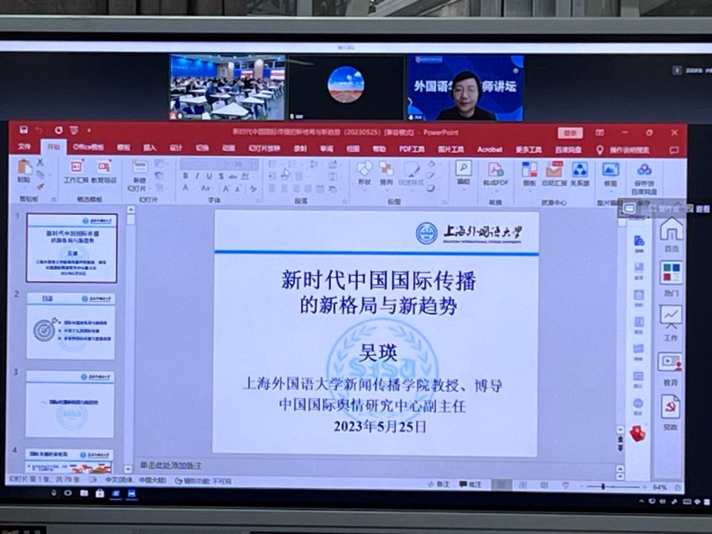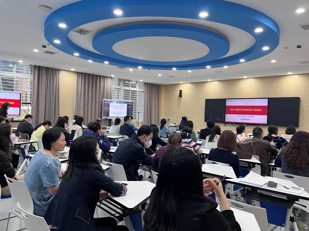 为助力外国语学院老师科研水平提升,深入了解跨学科研究的前沿和热点,近日,外国语学院邀请上海外国语大学博士生导师吴瑛教授在龙子湖校区1号教学楼以线上线下相结合的形式作题为《新时代国际传播的新格局与新趋势》的学术报告。外国语学院副院长马媛媛、巩坚及学院全体教师参加了会议。会议由马媛媛主持。